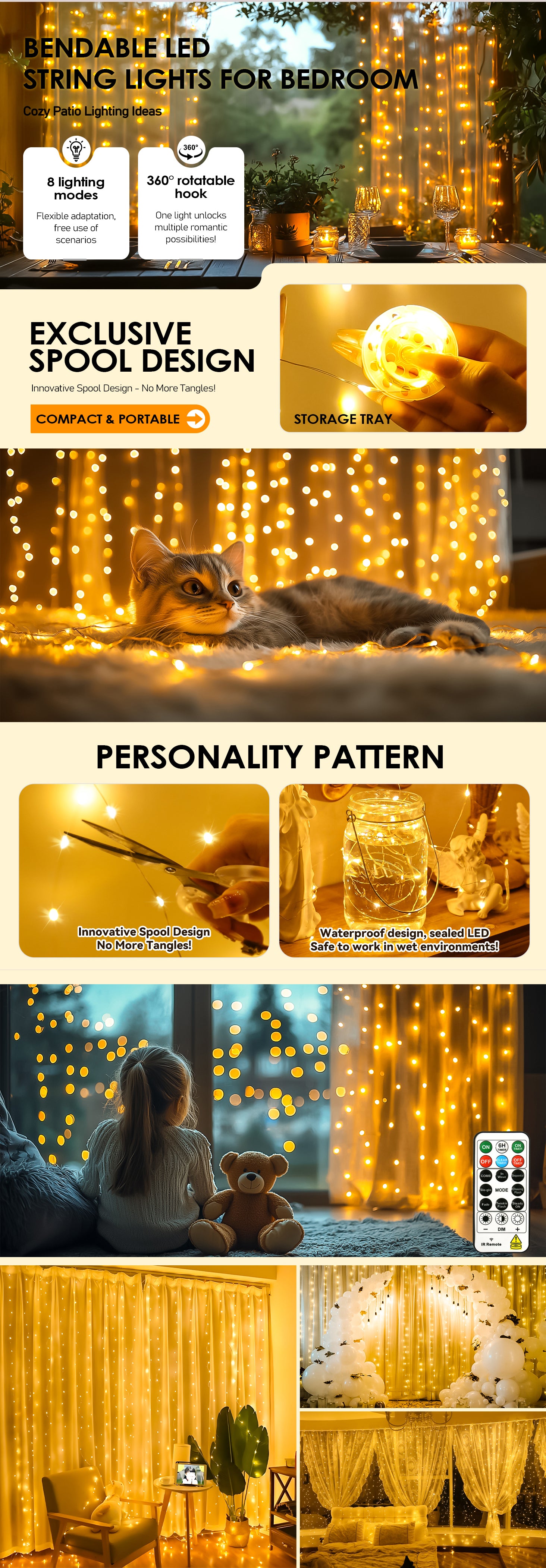 - Cozy Glow & Versatile Setup: 300 warm LEDs (9.8x9.8ft) + 5m power cord, comes with rotatable clips + sticky hooksperfect for bedrooms, weddings, and festive backdrops.