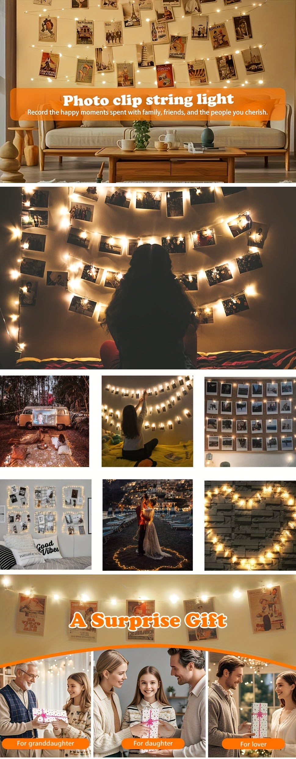 Fairy Light with Clips — 50 bright LEDs on 16.4ft string with 52 clear photo clips to display photos, cards, and artwork.