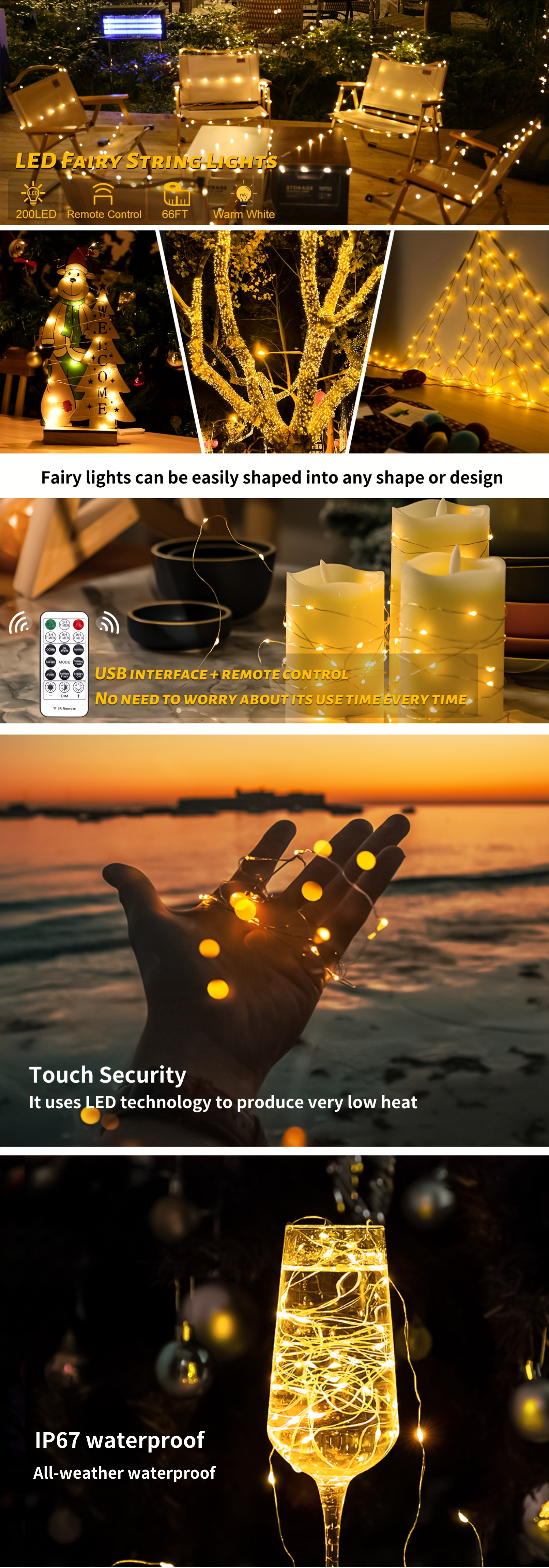 - Romantic & Flexible Design: Available in 66ft lengths, with 200 LEDs creates a soft, magical glow—perfect for decorating bedrooms, gardens, parties, and holidays.